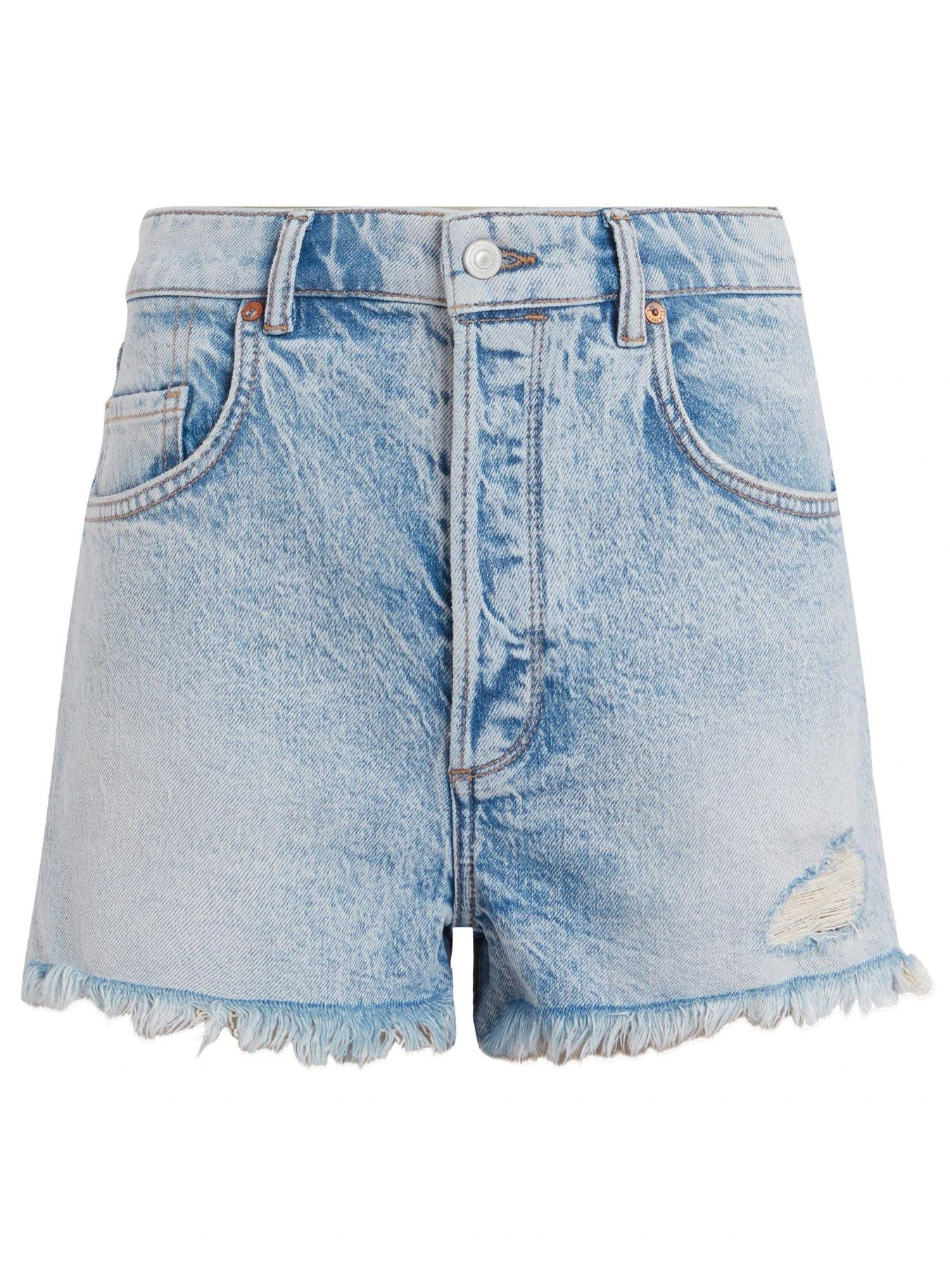 - A warm-weather essential, these denim shorts sit high on the waist and feature distressed detailing for a worn lookÂ