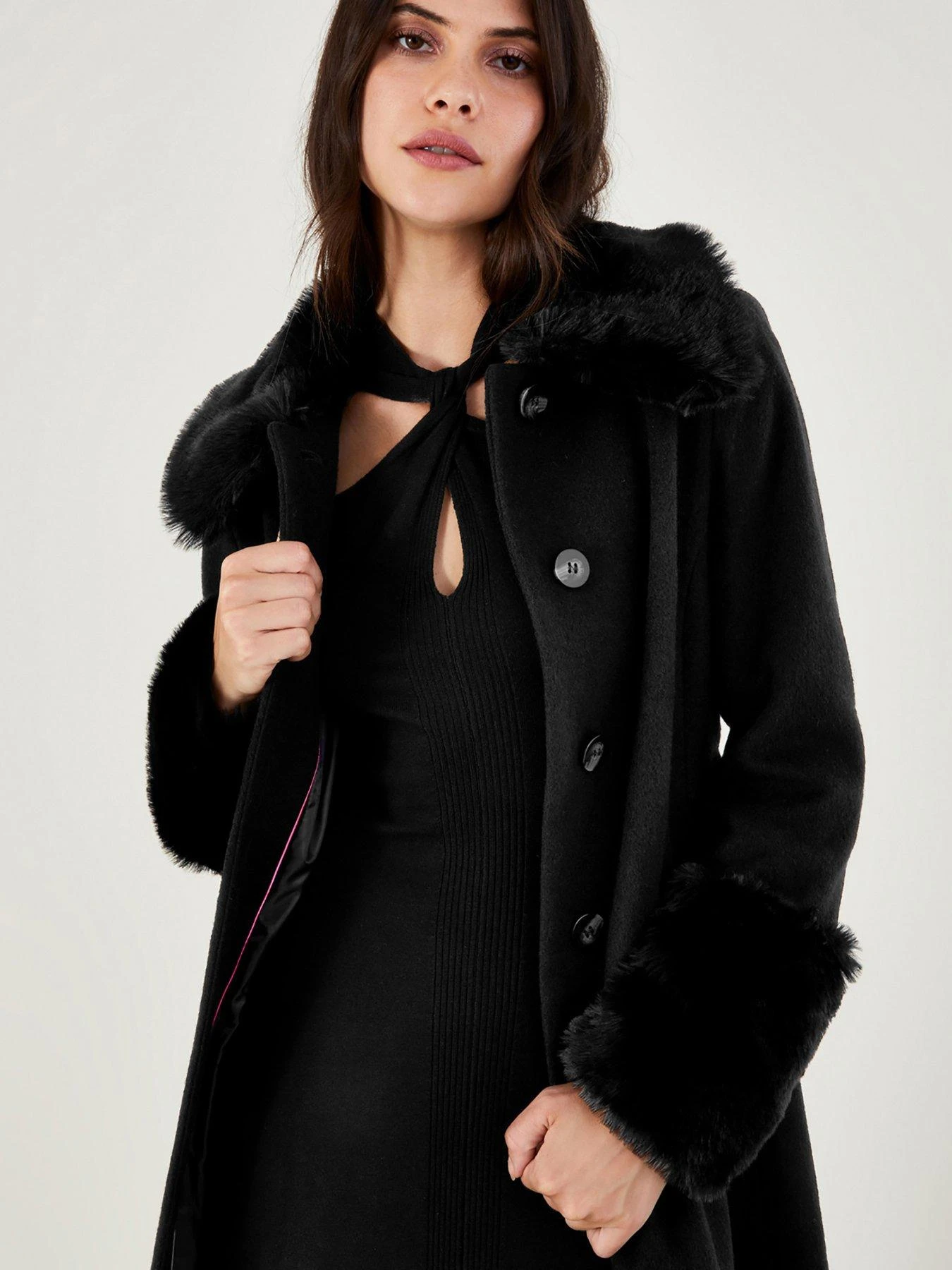Simply chic: Felicity’s faux fur trims exude old-school glamour, perfect for December nights out and winter dinner dates. She features a longline silhouette, with a button through fastening and tie-waist belt to keep your shape whilst staying warm.