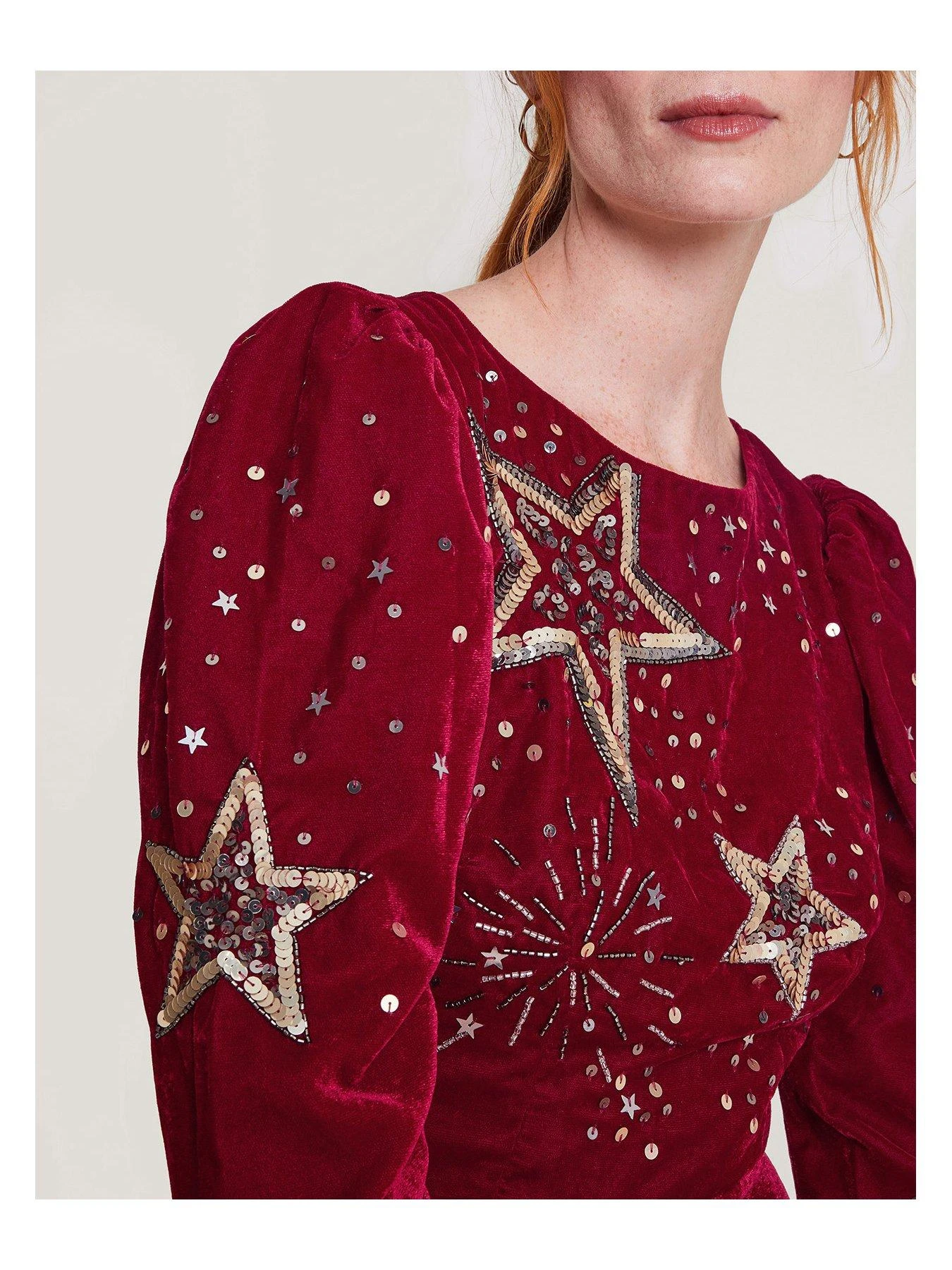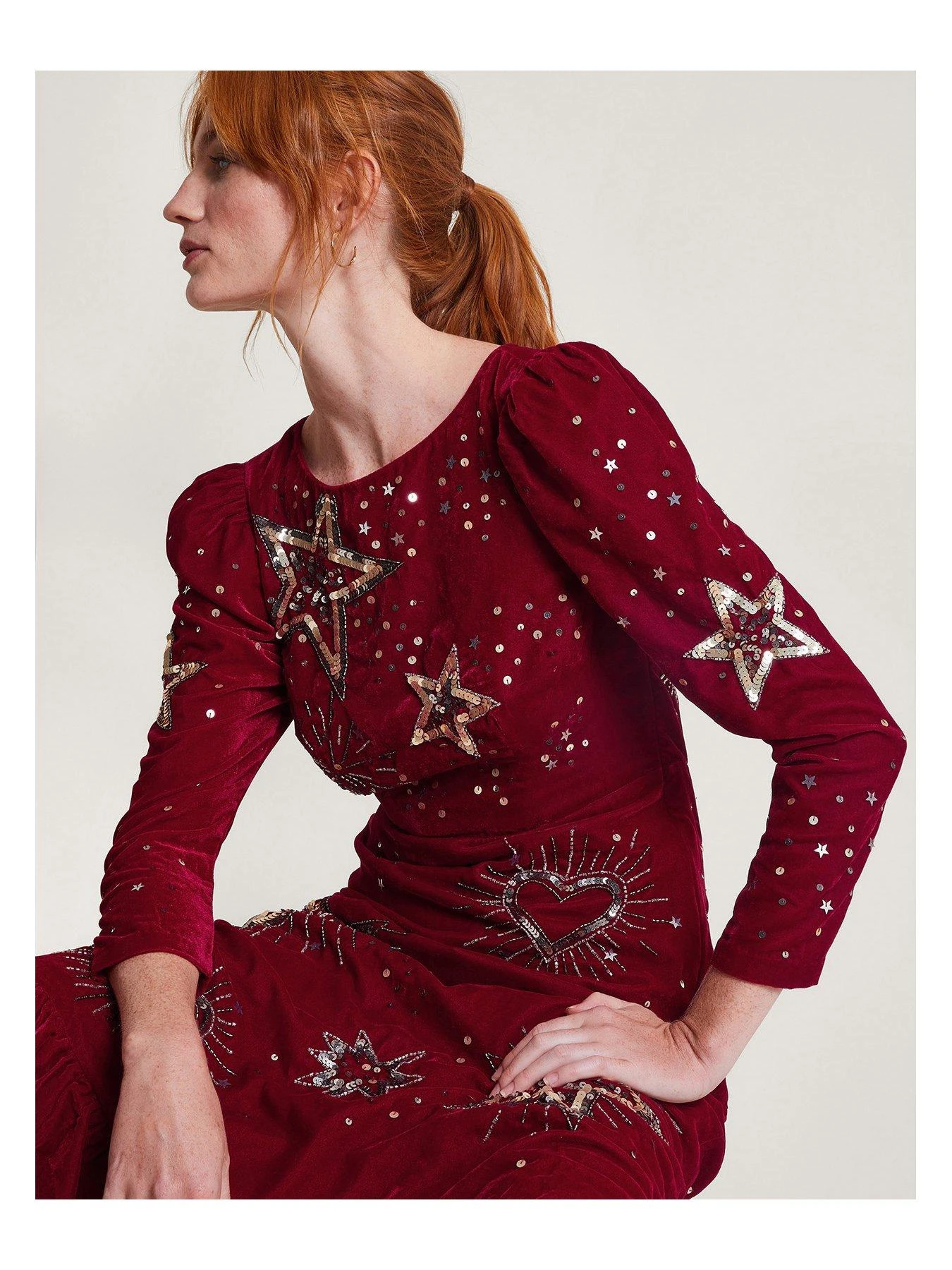 That festive party. This festive dress. It’s a pair made in heaven. Crafted in ruby red velvet, this midi features puff long sleeves and a tiered hem that adds to its already feminine feel. Topped with bursting embellishments, it fastens on the back with a keyhole button.