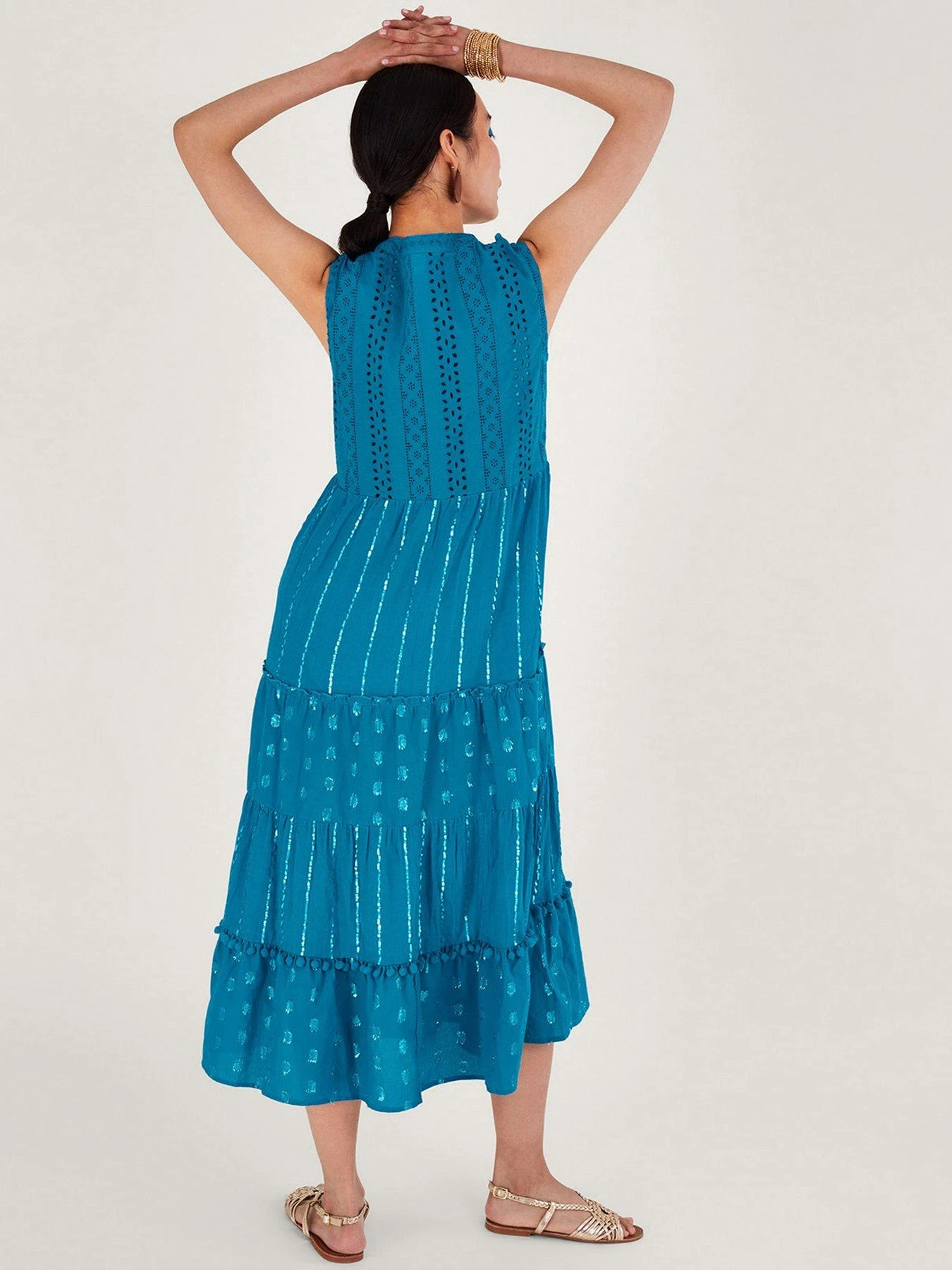 Our Sidne kaftan boasts tassels, pom-poms, broderie and metallic details textural elevation at it’s finest. Designed in better-sourced cotton, it has a sleeveless tiered profile that hems mid-calf.