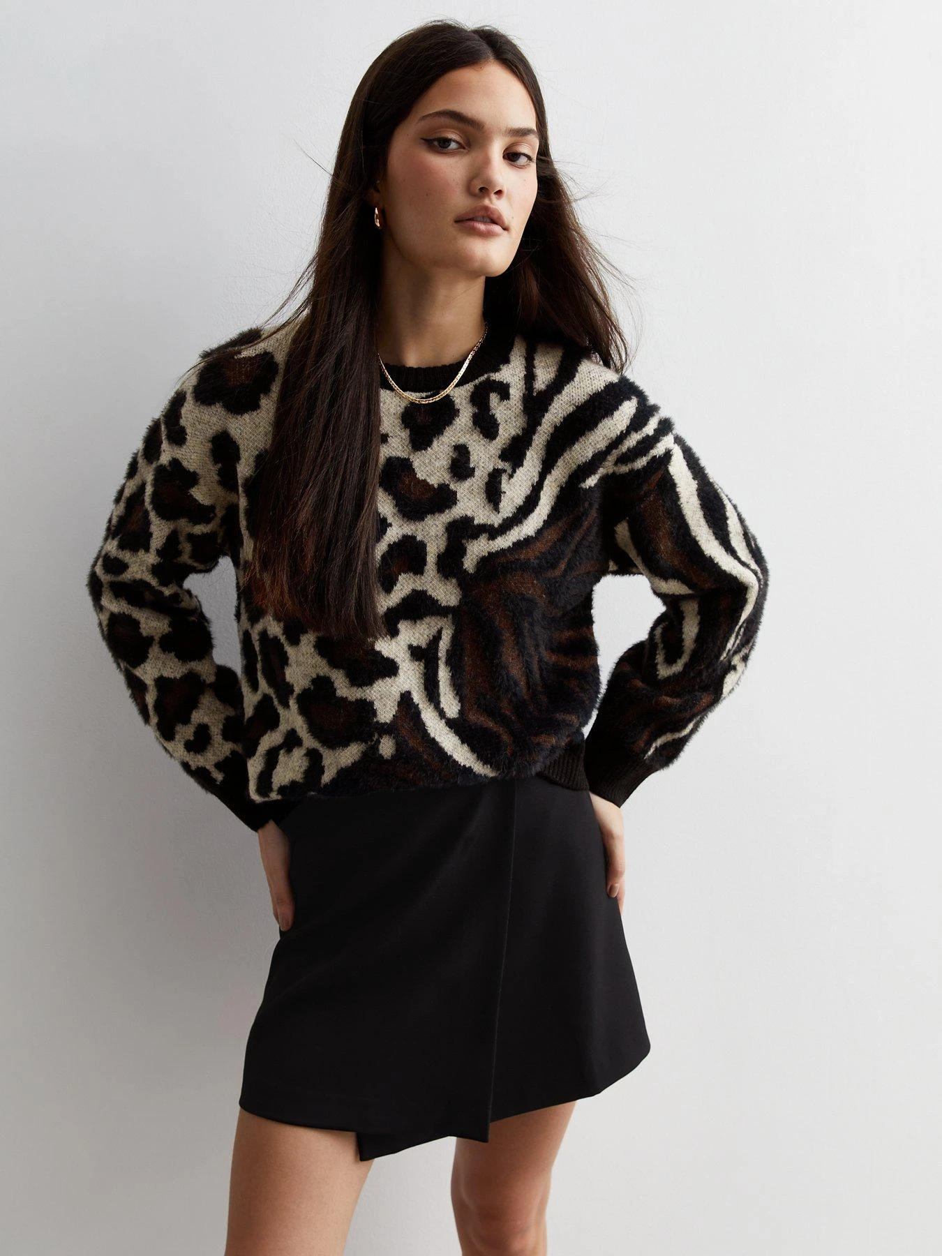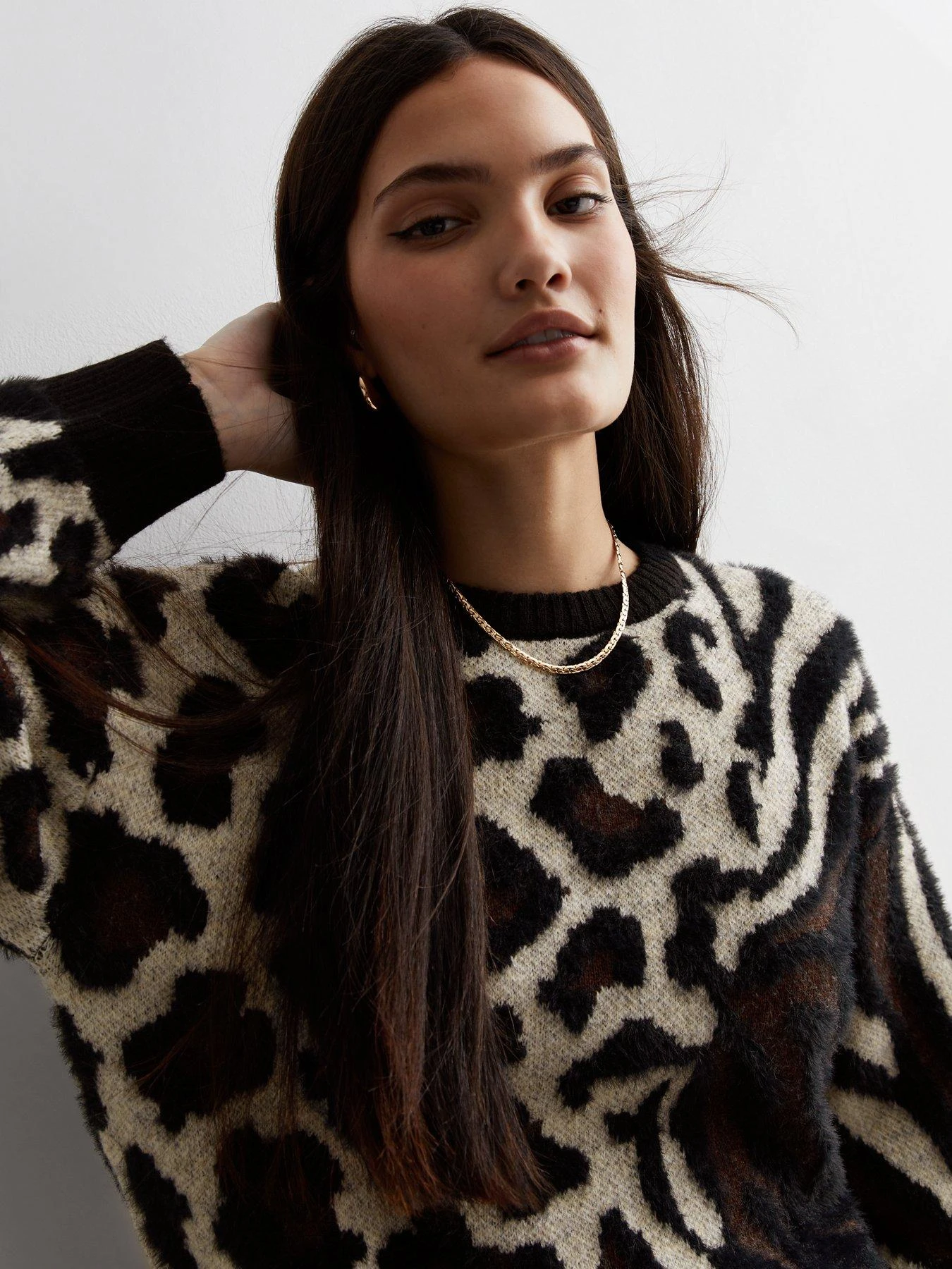 New Look Brown Fluffy Animal print Patchwork Jumper