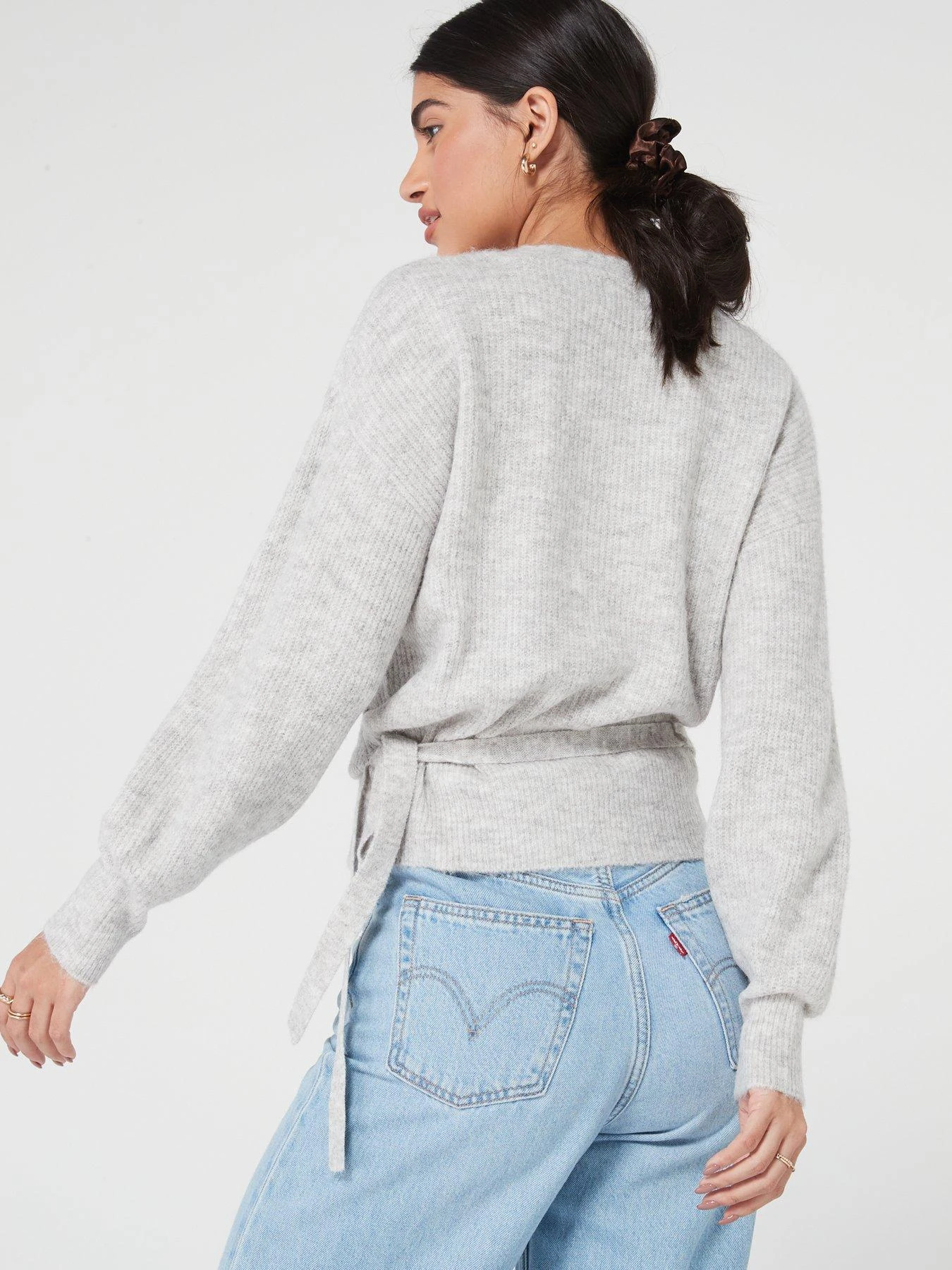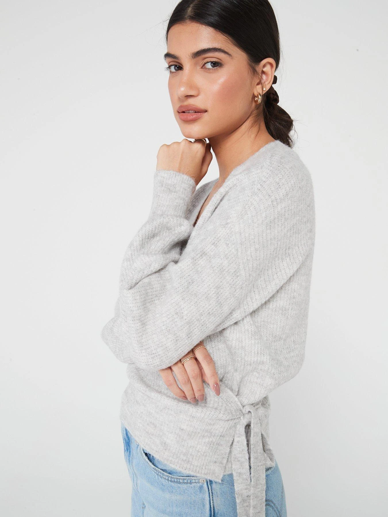 PIECES Ellen Long Sleeve Wrap Knit Cardigan – Grey
