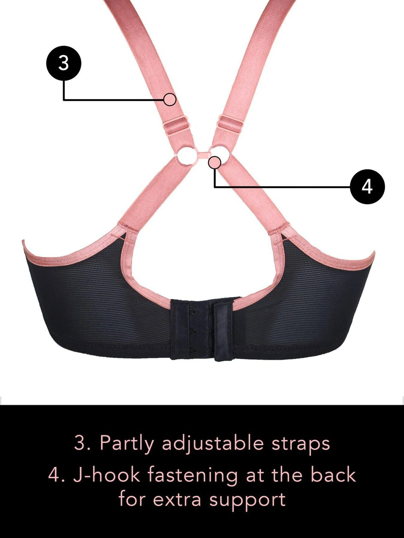 - J-hook fastening at the back for extra support, allowing you to convert to a racer back