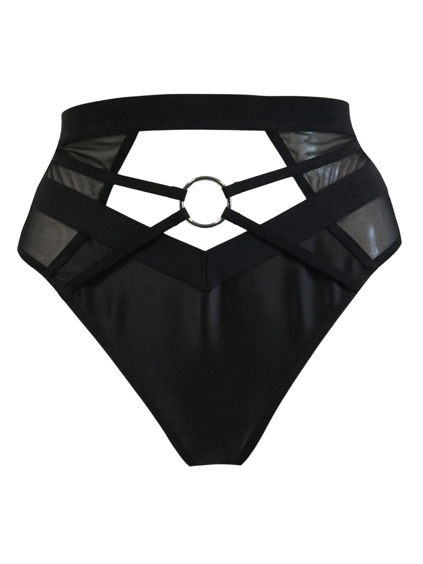 Create a truly unforgettable look with these high waisted thongs. Designed to shape your figure and create an hourglass illusion. This style with strapping and ring detailing is a must-have piece in any lingerie collection. Featuring luxe satin and mesh fabric with cut out detailing for a cheeky finish. Wear this sultry thong with the matching bra for a look to be obsessed with.