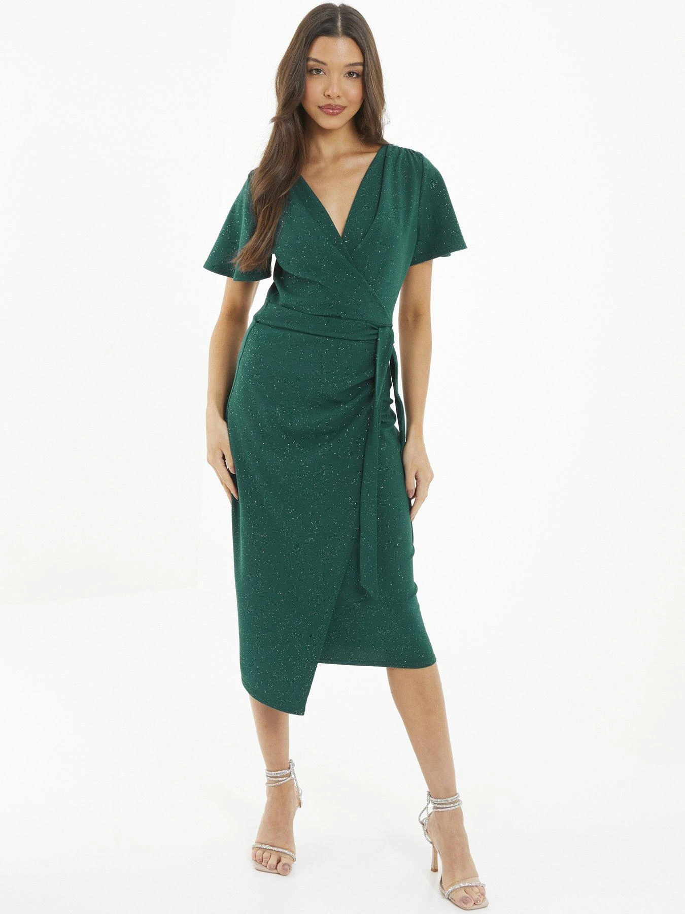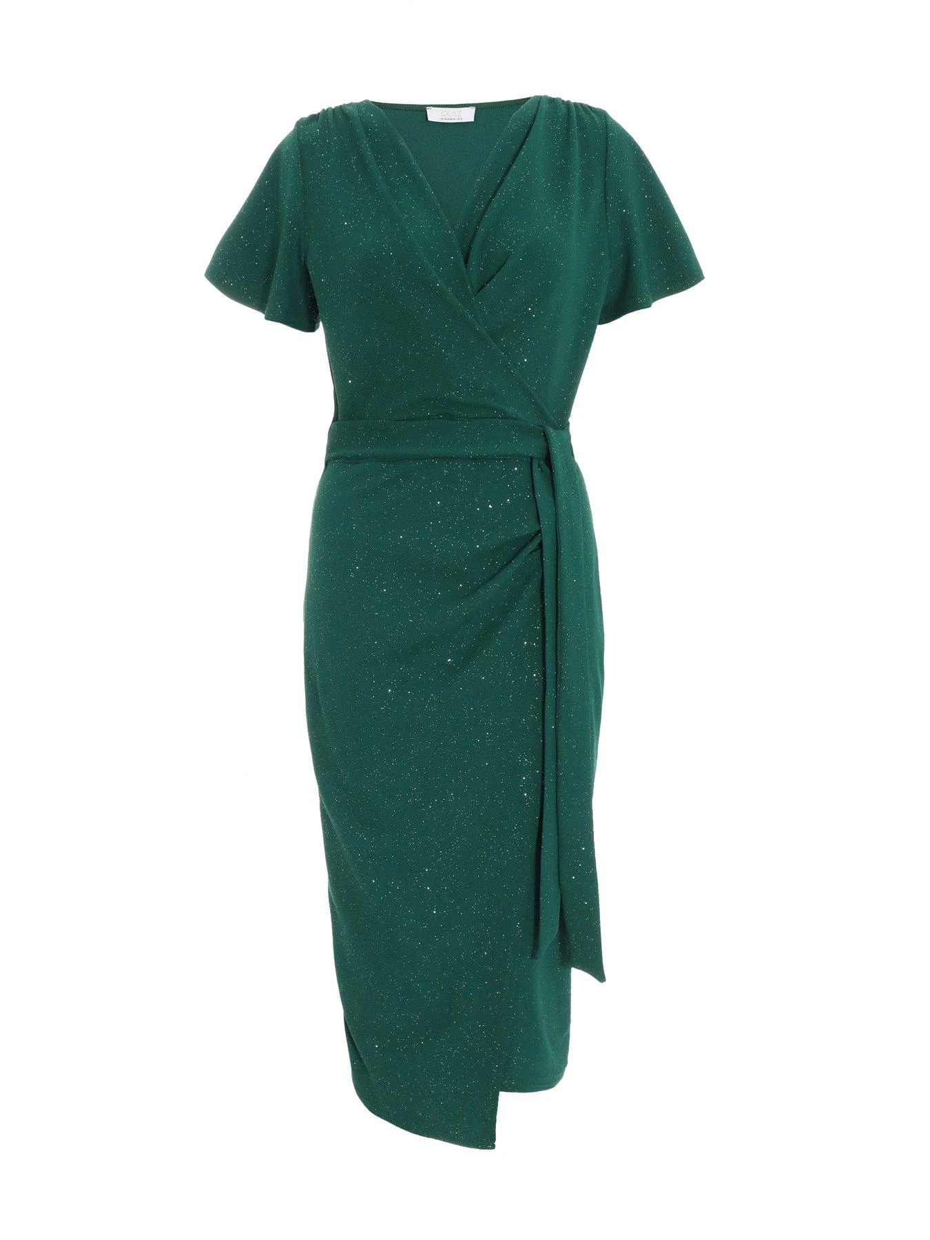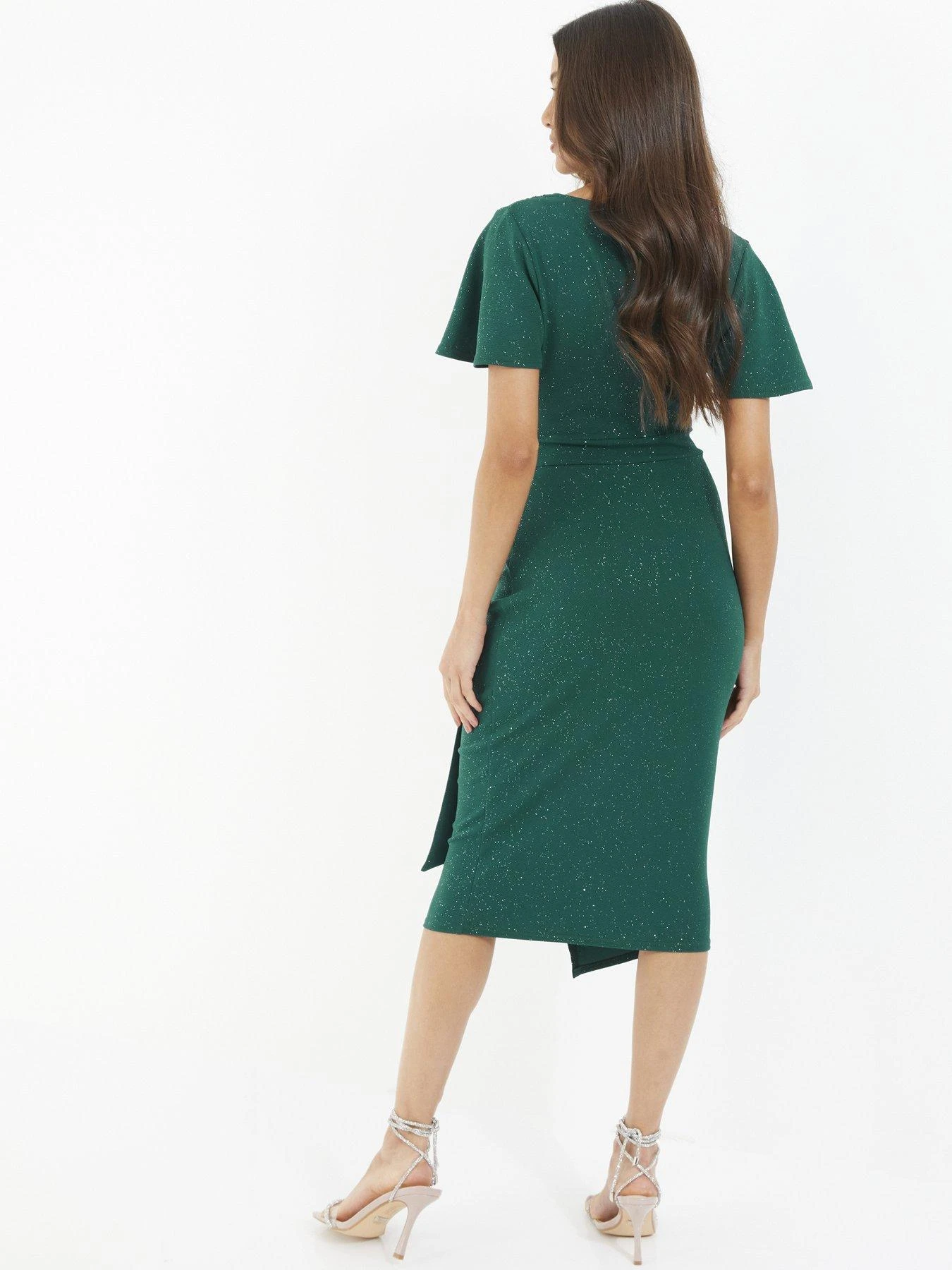 Quiz Bottle Green Glitter Ruched Wrap Midi Dress