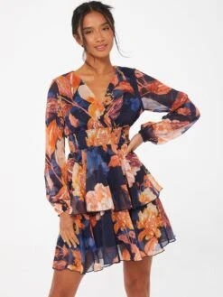 Quiz Petite Orange Chiffon Floral Tiered Skater Mini Dress