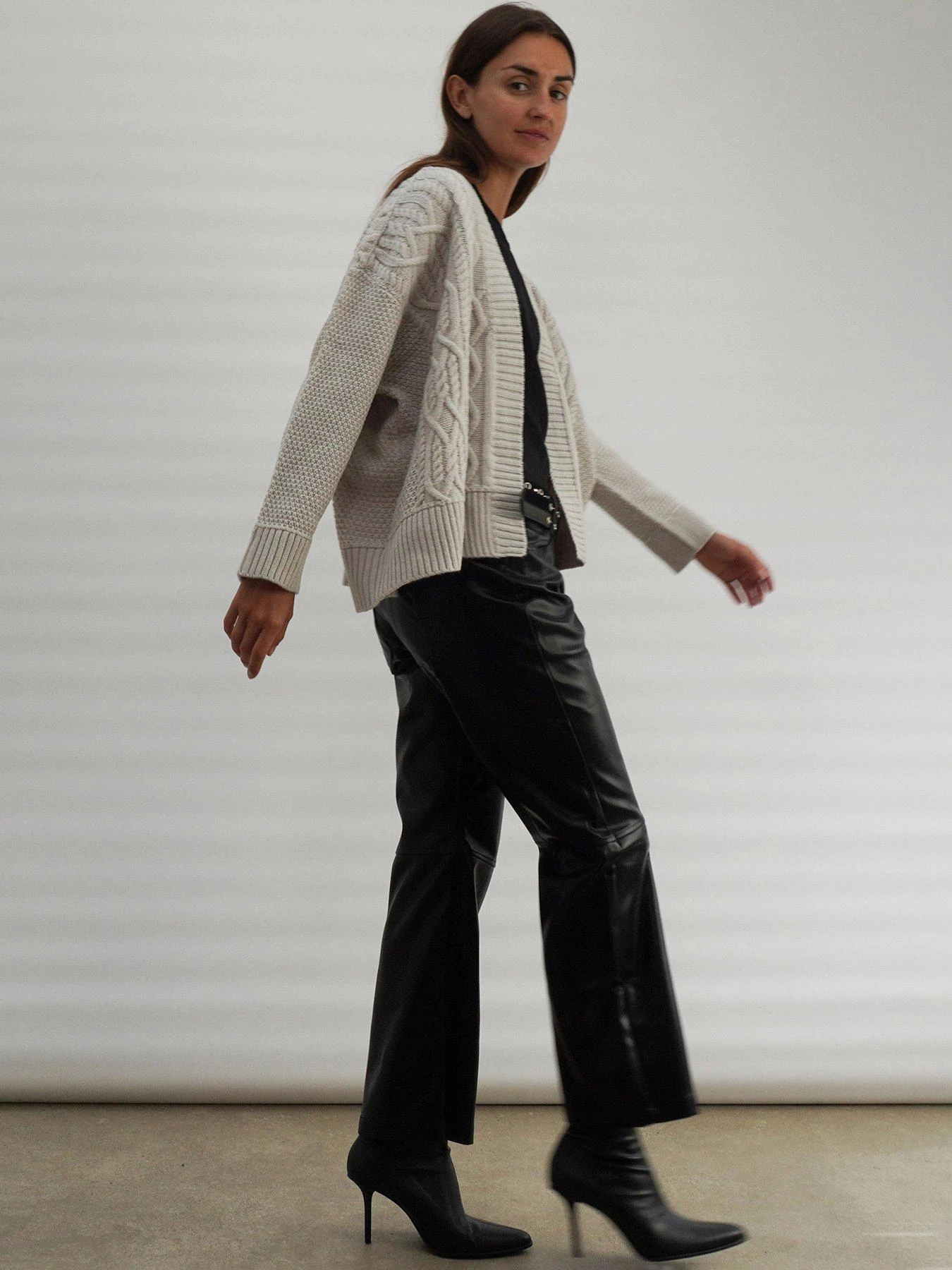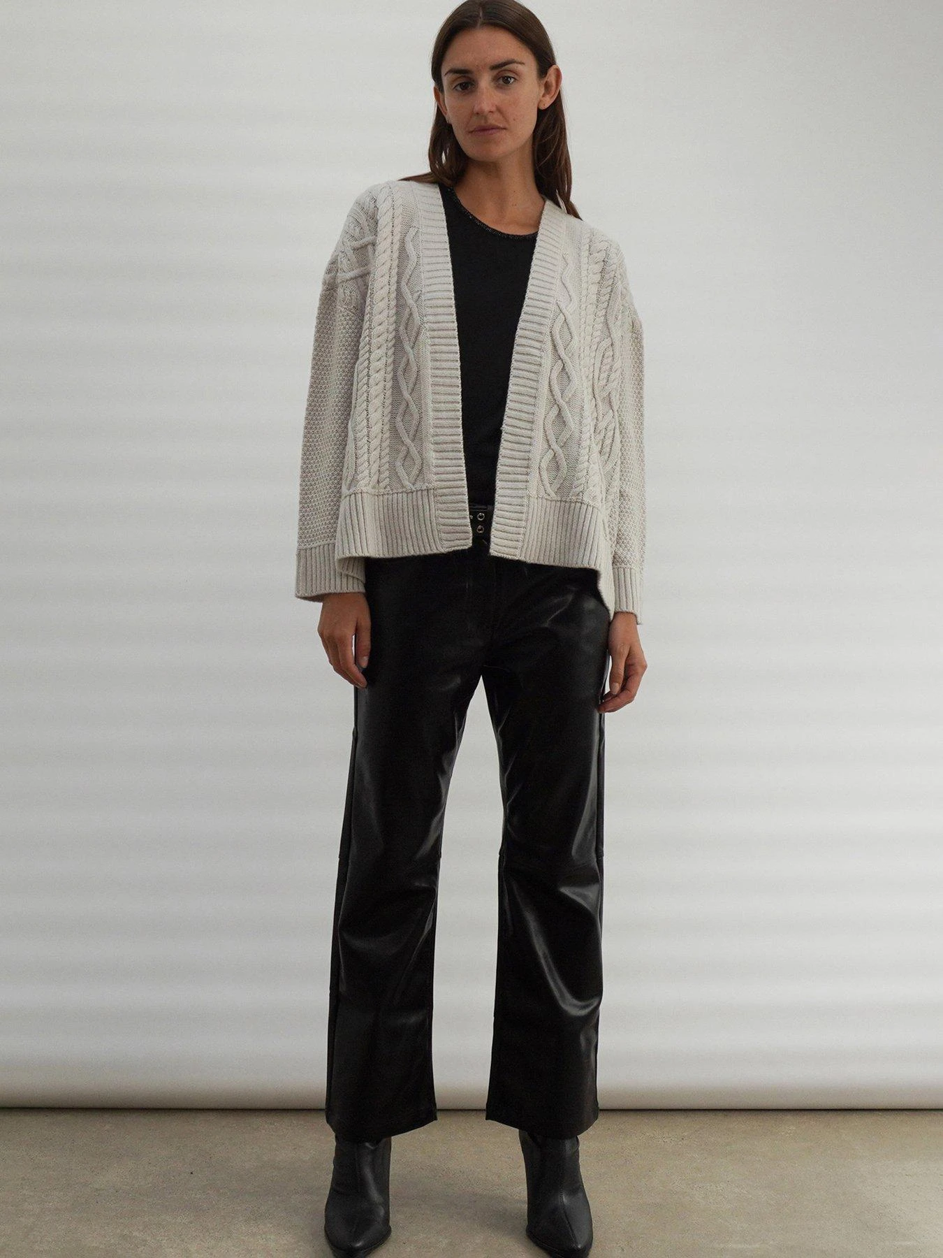 Cosy up in exquisite comfort with the Social cardigan in a wool mix soft yarn. This shorter style features a fine cable knit design, a relaxed hip length boxy fit with slimmer long sleeves. Wear over a tee or our beaded Wonder top for the ultimate comfortable yet stylish look. The model wears a size 10.