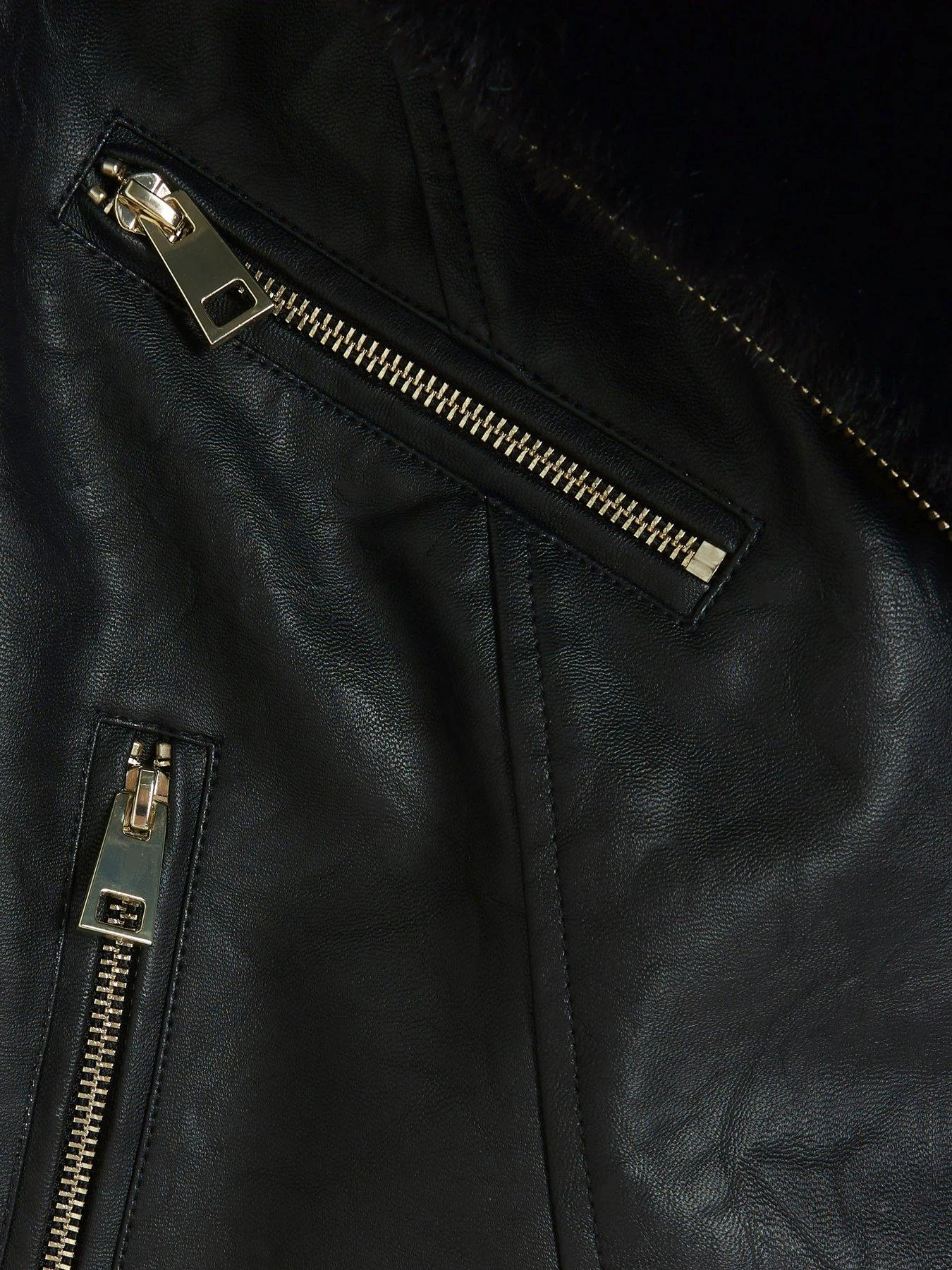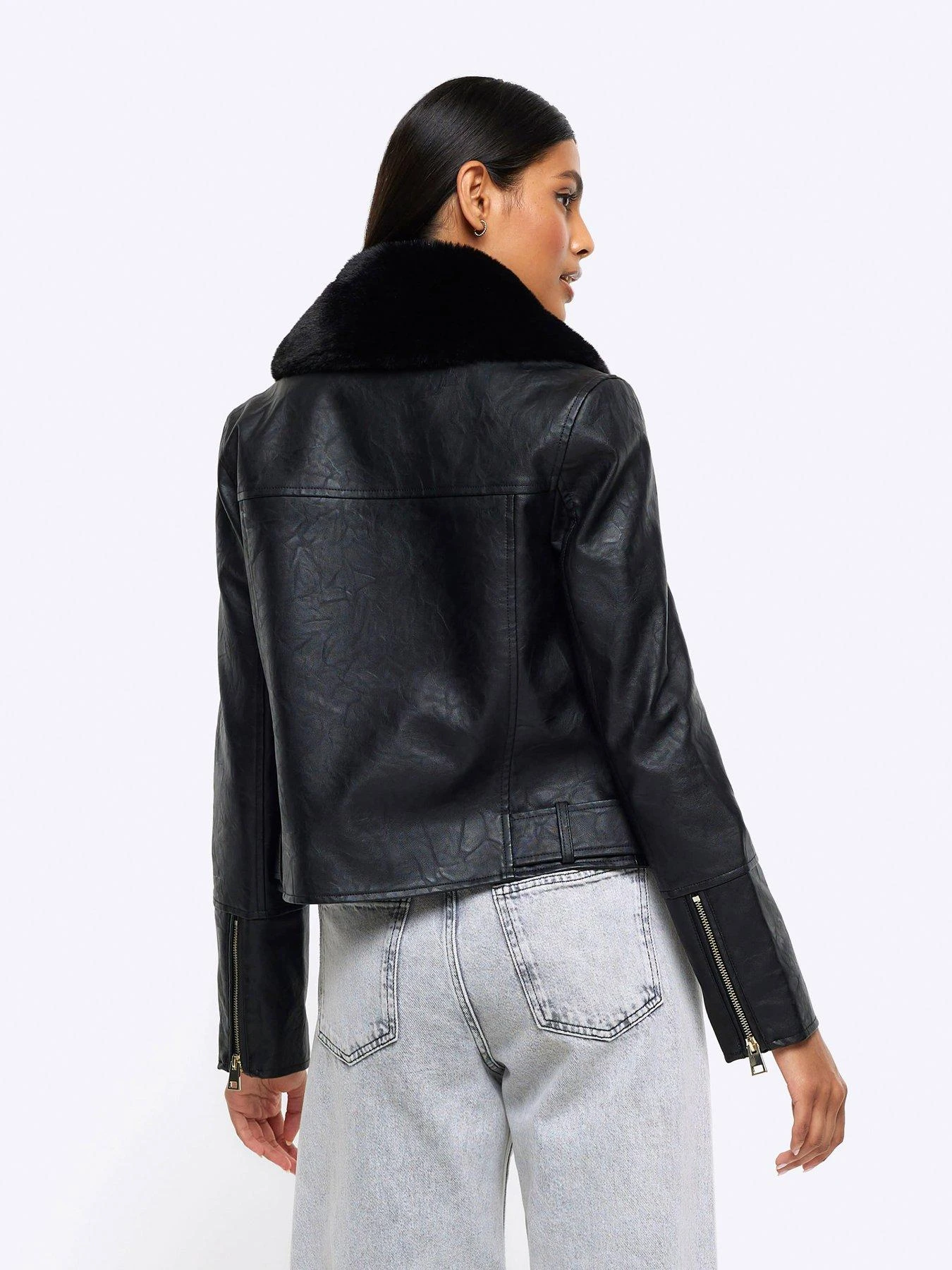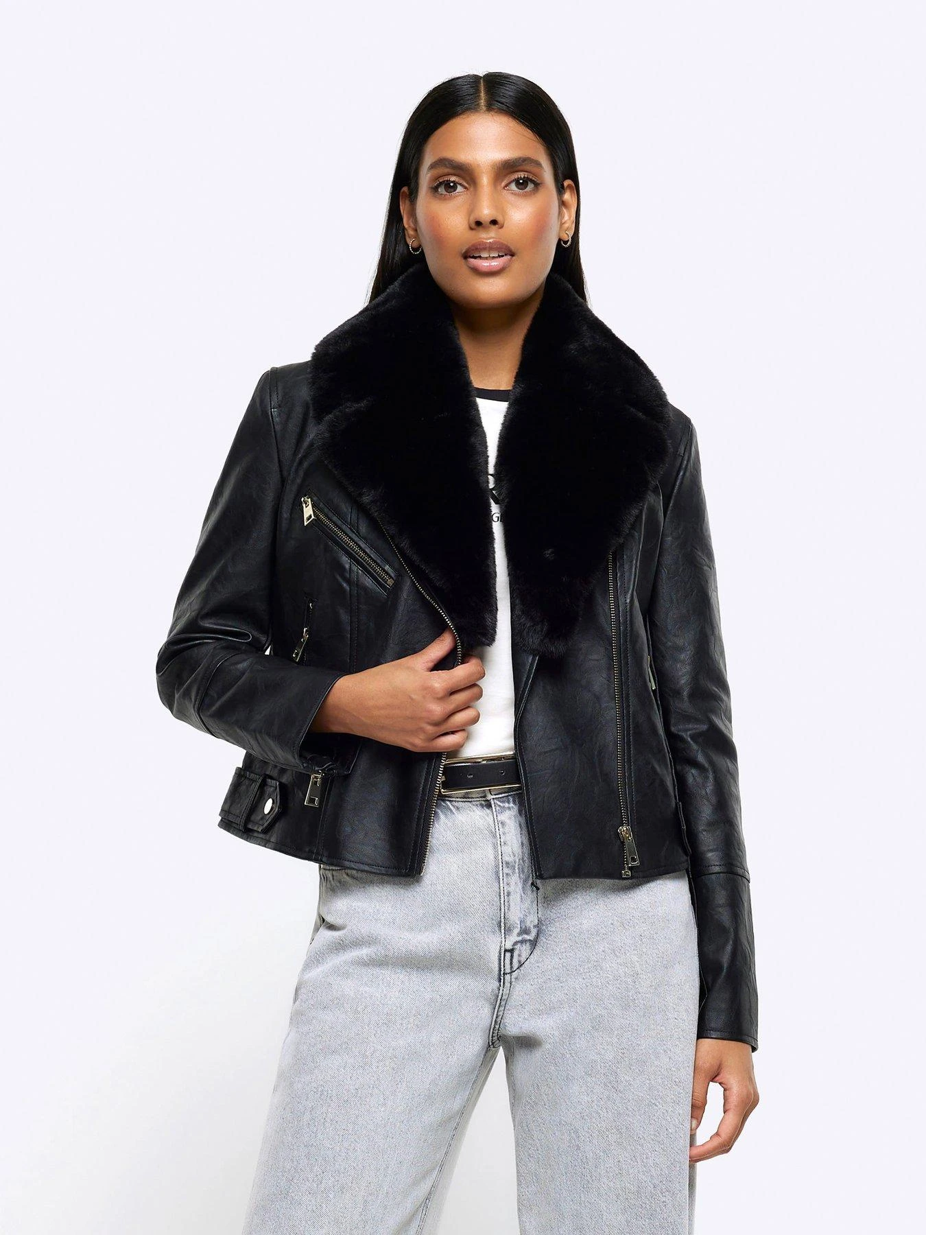 River Island Faux Fur Detail Biker Jacket – Black