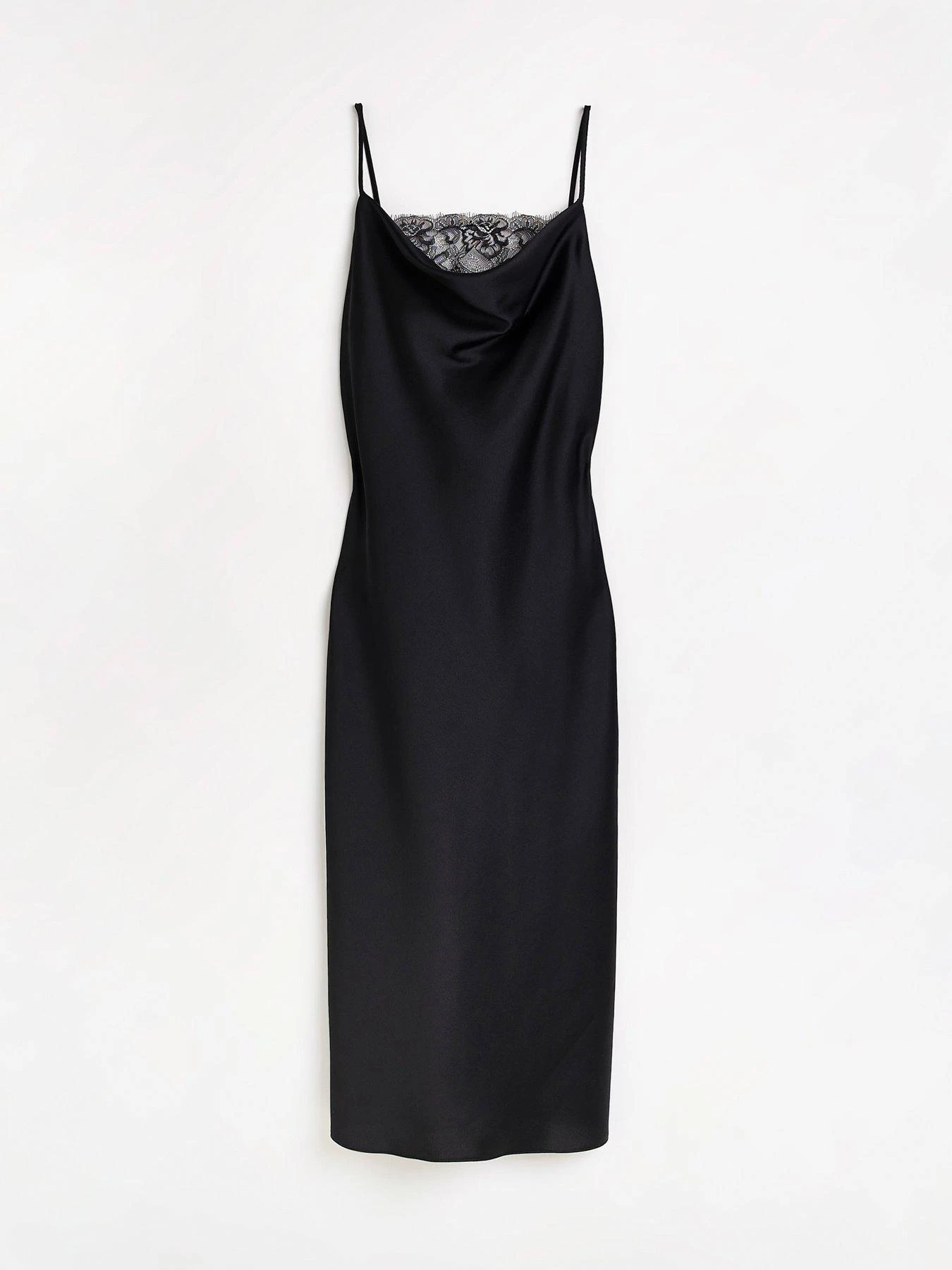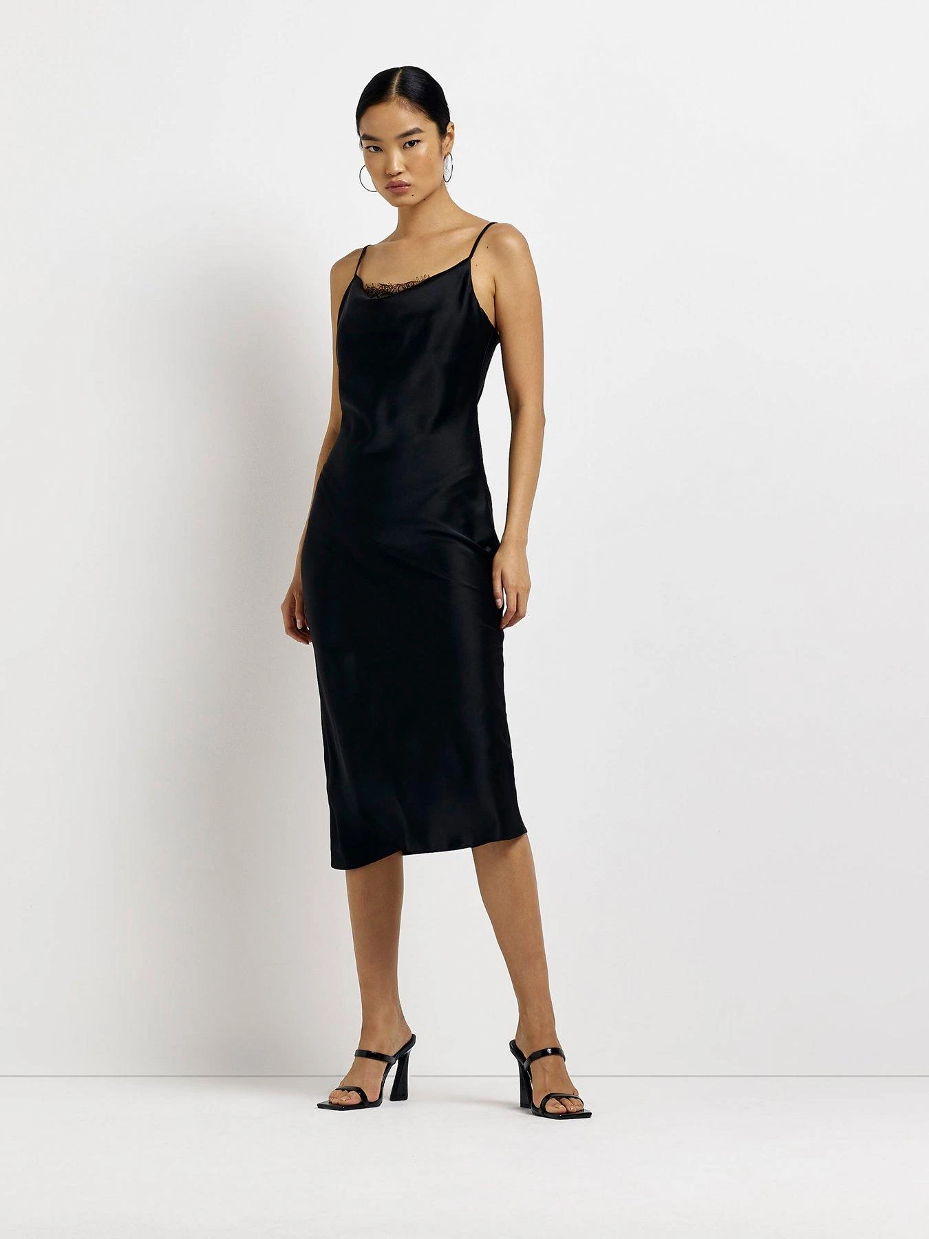 Satin fabric,Lace detail,V-neck,Sleeveless,Adjustable straps,Midi length,Our model wears a UK 8 and is 175cm/5’9” tall